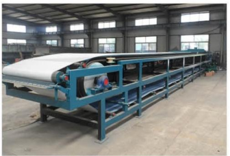 6、膠帶裙邊及擋板:采用EP200 四層聚酯布的環(huán)形橡膠帶,膠帶裙邊采用組合結(jié)構(gòu)即波形裙邊與平行膠帶粘合而成,這種結(jié)構(gòu)裙邊伸縮性好,可避免裙邊經(jīng)過輥筒改向破裂,可防止料液從兩側(cè)流出。橡膠帶的上部構(gòu)造為中間一排排水溝槽,溝槽中間鉆有真空排液孔,鉆空部位為純橡膠無布層,可防止液體通過布層纖維進入橡膠層導(dǎo)致膠帶分層,大大的延長了橡膠帶的使用壽命。